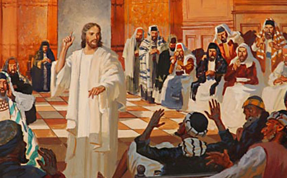 ketika Yesus pulang dan berkotbah di rumah ibadat pada hari sabat.
