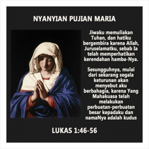kata Maria: “jiwaku memuliakan Tuhan, dan hatiku bergembira karena Allah, Juruselamatku, sebab Ia telah memperhatikan kerendahan hambaNya. sesungguhnya, mulai dari sekarang segala keturunan akan menyebut aku berbahagia, karena Yang Mahakuasa telah melakukan perbuatan-perbuatan besar kepadaku dan namaNya adalah kudus.