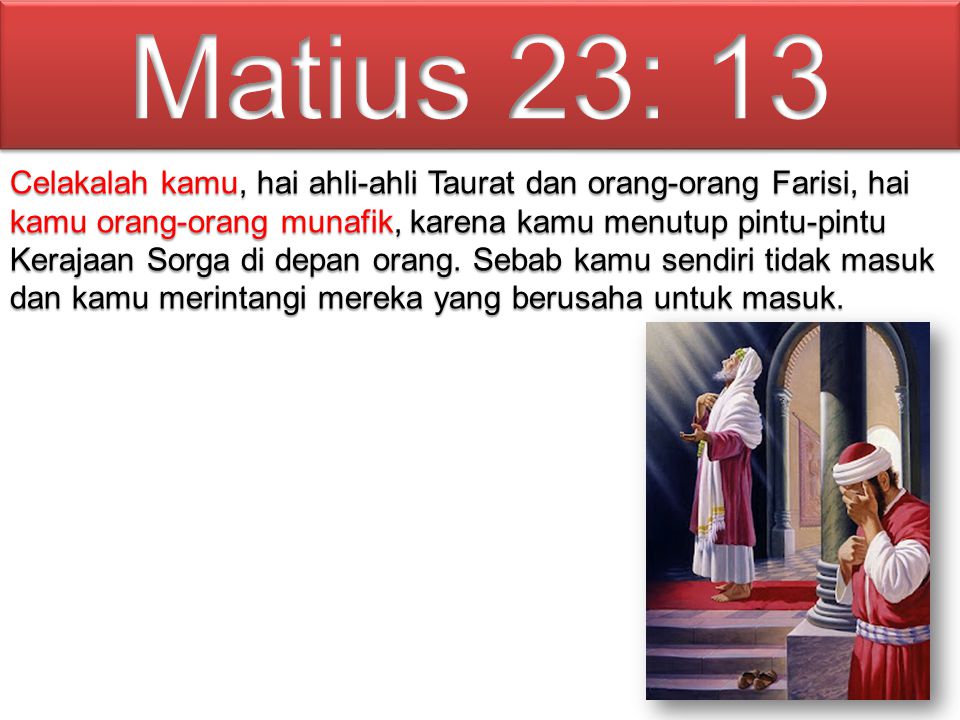 karena kamu menutup pintu-pintu Kerajaan Sorga di depan orang. Sebab kamu sendiri tidak masuk dan kamu merintangi mereka yang berusaha untuk masuk. (Matius 23:13)