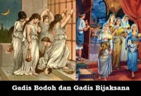 Pada waktu itu hal Kerajaan Sorga seumpama sepuluh gadis, yang mengambil pelitanya dan pergi menyongsong mempelai laki-laki. Lima di antaranya bodoh dan lima bijaksana. Gadis-gadis yang bodoh itu membawa pelitanya, tetapi tidak membawa minyak, sedangkan gadis-gadis yang bijaksana itu membawa pelitanya dan juga minyak dalam buli-buli mereka.