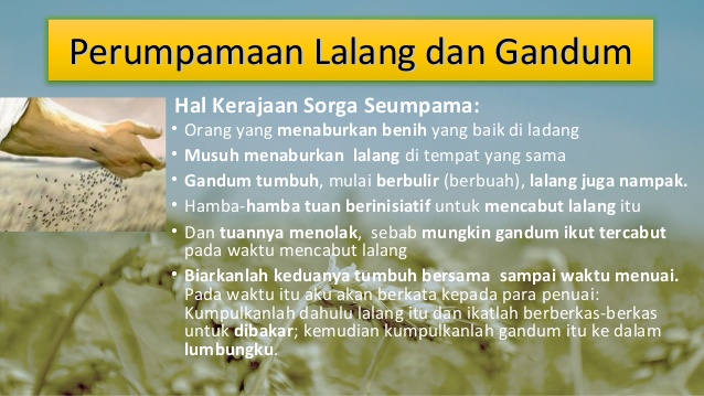 Perumpamaan lalang diantara gandum menyatakan bahwa orang jahat dan orang benar akan selalu ada di dalam dunia ini.