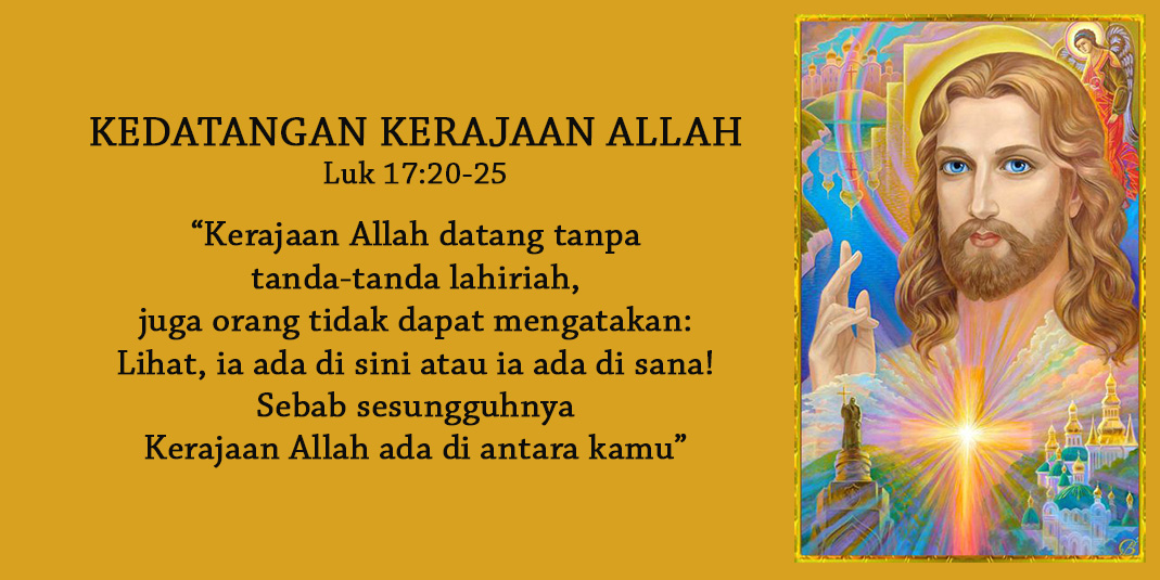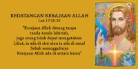 “Kerajaan Allah datang tanpa tanda-tanda lahiriah, juga orang tidak dapat mengatakan: Lihat, ia ada di sini atau ia ada di sana! Sebab sesungguhnya Kerajaan Allah ada di antara kamu.”