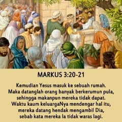 Kemudian Yesus masuk ke sebuah rumah. Maka datanglah orang banyak berkerumun pula, sehingga makanpun mereka tidak dapat. Waktu kaum keluargaNya mendengar hal itu, mereka datang hendak mengambil Dia, sebab kata mereka Ia tidak waras lagi.