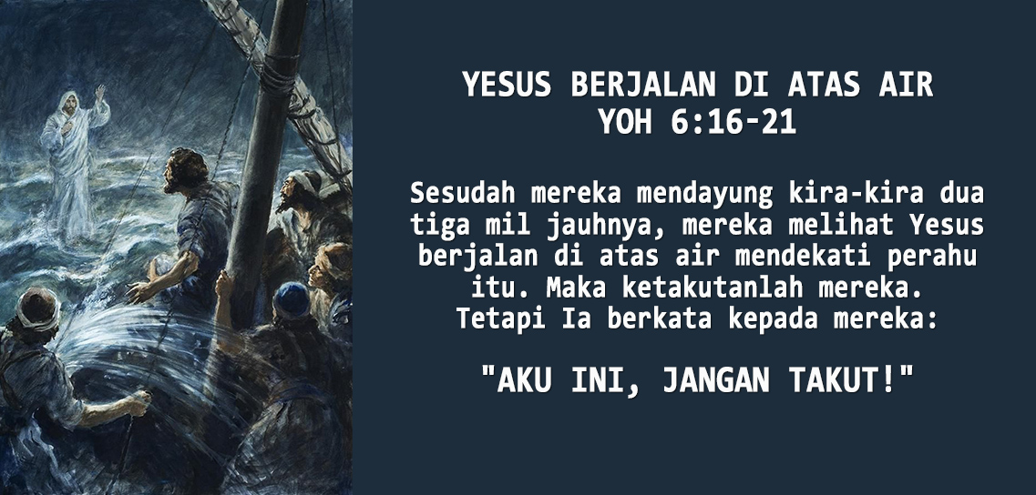 Sesudah mereka mendayung kira-kira dua tiga mil jauhnya, mereka melihat Yesus berjalan di atas air mendekati perahu itu. Maka ketakutanlah mereka. Tetapi Ia berkata kepada mereka: “Aku ini, jangan takut!”