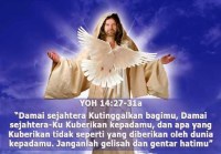 Damai sejahtera Kutinggalkan bagimu. Damai sejahteraKu Kuberikan kepadamu, dan apa yang Kuberikan tidak seperti yang diberikan oleh dunia kepadamu. Janganlah gelisah dan gentar hatimu.