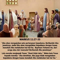 Yesus dan murid-muridNya tiba pula di Yerusalem. Ketika Yesus berjalan di halaman Bait Allah, datanglah kepadaNya imam-imam kepala, ahli-ahli Taurat dan tua-tua, dan bertanya kepadaNya: