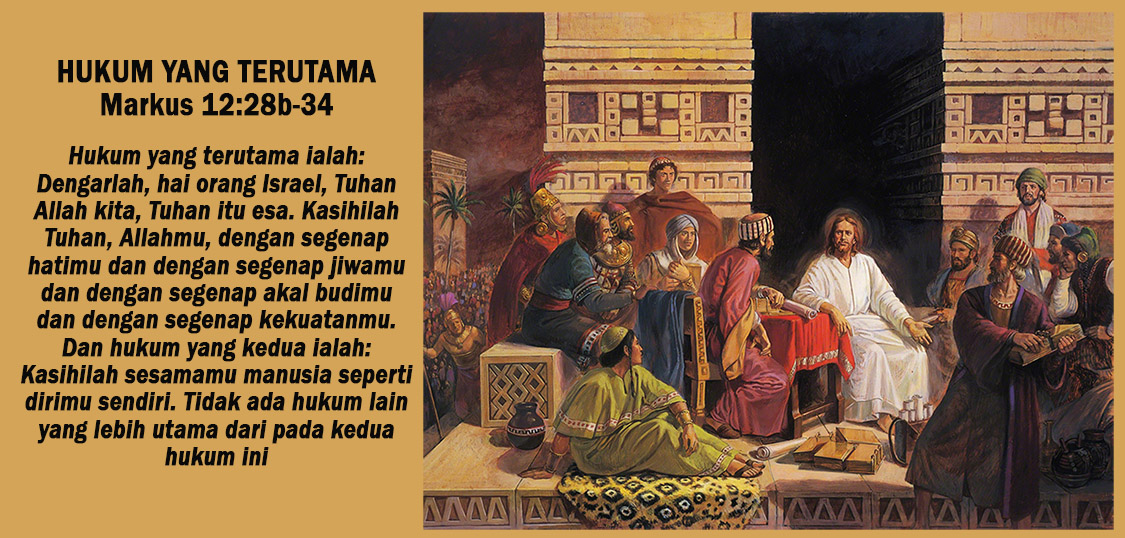 Kasihilah Tuhan, Allahmu, dengan segenap hatimu dan dengan segenap jiwamu dan dengan segenap akal budimu dan dengan segenap kekuatanmu. Dan hukum yang kedua ialah: Kasihilah sesamamu manusia seperti dirimu sendiri. Tidak ada hukum lain yang lebih utama dari pada kedua hukum ini.