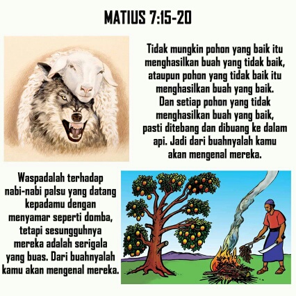 Waspadalah terhadap nabi-nabi palsu yang datang kepadamu dengan menyamar seperti domba, tetapi sesungguhnya mereka adalah serigala yang buas. Dari buahnyalah kamu akan mengenal mereka.