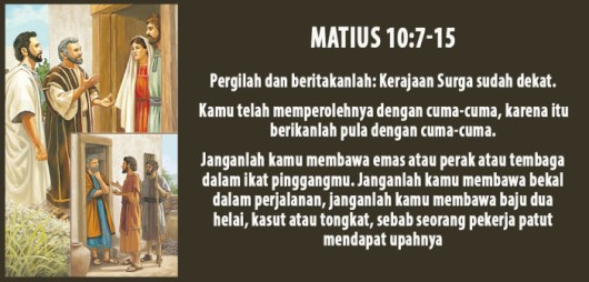 Pergilah dan beritakanlah: Kerajaan Sorga sudah dekat. Sembuhkanlah orang sakit; bangkitkanlah orang mati; tahirkanlah orang kusta; usirlah setan-setan.