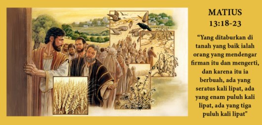 Yang ditaburkan di tanah yang baik ialah orang yang mendengar firman itu dan mengerti, dan karena itu ia berbuah, ada yang seratus kali lipat, ada yang enam puluh kali lipat, ada yang tiga puluh kali lipat.