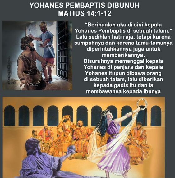 Disuruhnya memenggal kepala Yohanes di penjara dan kepala Yohanes itupun dibawa orang di sebuah talam, lalu diberikan kepada gadis itu dan ia membawanya kepada ibunya. Kemudian datanglah murid-murid Yohanes Pembaptis mengambil mayatnya dan menguburkannya. Lalu pergilah mereka memberitahukannya kepada Yesus.