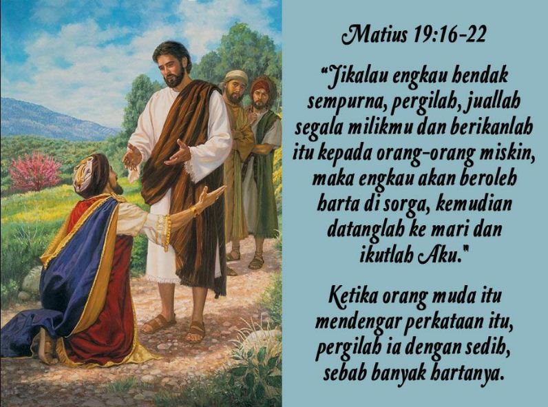 Kata Yesus kepadanya: “Jikalau engkau hendak sempurna, pergilah, juallah segala milikmu dan berikanlah itu kepada orang-orang miskin, maka engkau akan beroleh harta di sorga, kemudian datanglah ke mari dan ikutlah Aku.”