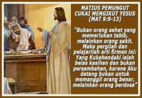 Setelah Yesus pergi dari situ, Ia melihat seorang yang bernama Matius duduk di rumah cukai, lalu Ia berkata kepadanya: “Ikutlah Aku.” Maka berdirilah Matius lalu mengikut Dia.