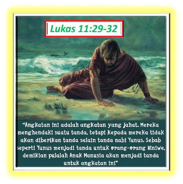 Ketika orang banyak mengerumuniNya, berkatalah Yesus: “Angkatan ini adalah angkatan yang jahat. Mereka menghendaki suatu tanda, tetapi kepada mereka tidak akan diberikan tanda selain tanda nabi Yunus.