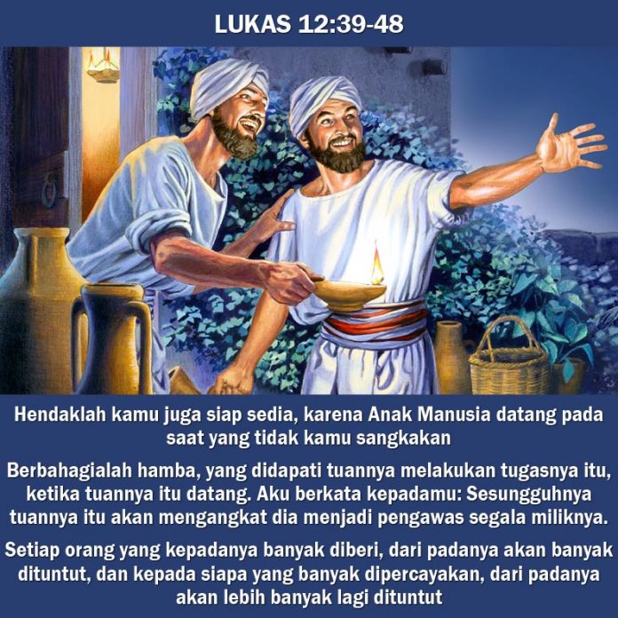 Hendaklah kamu juga siap sedia, karena Anak Manusia datang pada saat yang tidak kamu sangkakan.