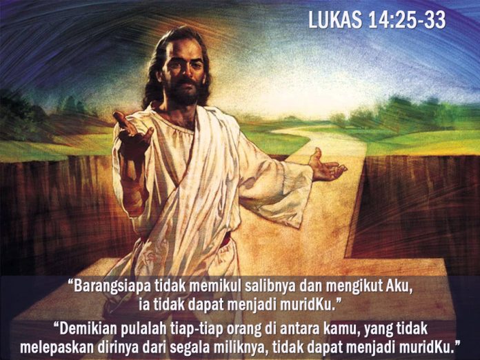 Barangsiapa tidak memikul salibnya dan mengikut Aku, ia tidak dapat menjadi muridKu. Demikian pulalah tiap-tiap orang di antara kamu, yang tidak melepaskan dirinya dari segala miliknya, tidak dapat menjadi muridKu
