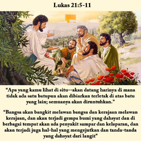 Ketika beberapa orang berbicara tentang Bait Allah dan mengagumi bangunan itu yang dihiasi dengan batu yang indah-indah dan dengan berbagai-bagai barang persembahan, berkatalah Yesus: “Apa yang kamu lihat di situ — akan datang harinya di mana tidak ada satu batupun akan dibiarkan terletak di atas batu yang lain; semuanya akan diruntuhkan.