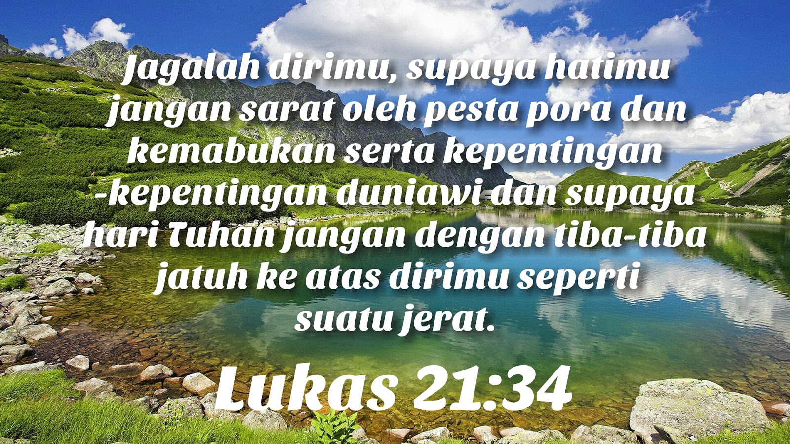 Jagalah dirimu, supaya hatimu jangan sarat oleh pesta pora dan kemabukan serta kepentingan-kepentingan duniawi dan supaya hari Tuhan jangan dengan tiba-tiba jatuh ke atas dirimu seperti suatu jerat