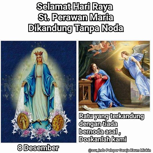 Dalam kalender liturgi katolik, hari ini memperingati hari Santa Perawan Maria dikandung tanpa dosa.