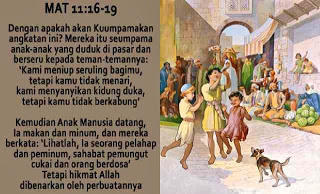 Dengan apakah akan Kuumpamakan angkatan ini? Mereka itu seumpama anak-anak yang duduk di pasar dan berseru kepada teman-temannya: Kami meniup seruling bagimu, tetapi kamu tidak menari, kami menyanyikan kidung duka, tetapi kamu tidak berkabung.
