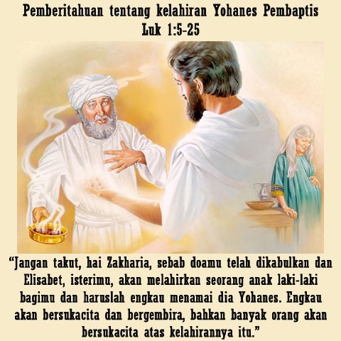 Tetapi malaikat itu berkata kepadanya: “Jangan takut, hai Zakharia, sebab doamu telah dikabulkan dan Elisabet, isterimu, akan melahirkan seorang anak laki-laki bagimu dan haruslah engkau menamai dia Yohanes. Engkau akan bersukacita dan bergembira, bahkan banyak orang akan bersukacita atas kelahirannya itu.