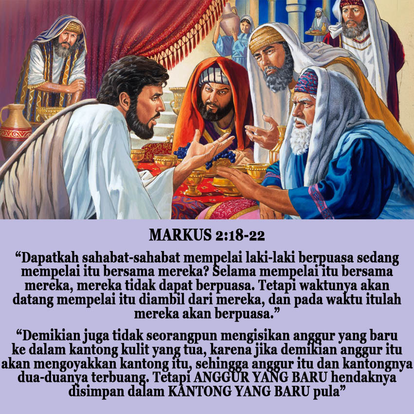 Jawab Yesus kepada mereka: “Dapatkah sahabat-sahabat mempelai laki-laki berpuasa sedang mempelai itu bersama mereka? Selama mempelai itu bersama mereka, mereka tidak dapat berpuasa.