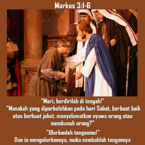 Kali ini mereka melihat di rumah ibadat, Yesus menyembuhkan seorang yang mati sebelah tangannya pada hari Sabat.