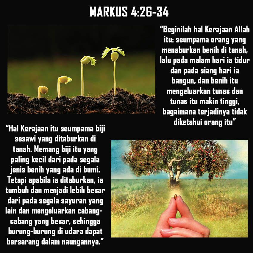 Kata Yesus: “Beginilah hal Kerajaan Allah itu: seumpama orang yang menaburkan benih di tanah, Hal Kerajaan itu seumpama biji sesawi yang ditaburkan di tanah. Memang biji itu yang paling kecil dari pada segala jenis benih yang ada di bumi