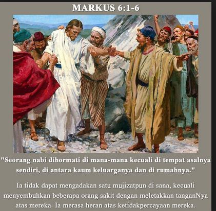 Maka Yesus berkata kepada mereka: “Seorang nabi dihormati di mana-mana kecuali di tempat asalnya sendiri, di antara kaum keluarganya dan di rumahnya.”