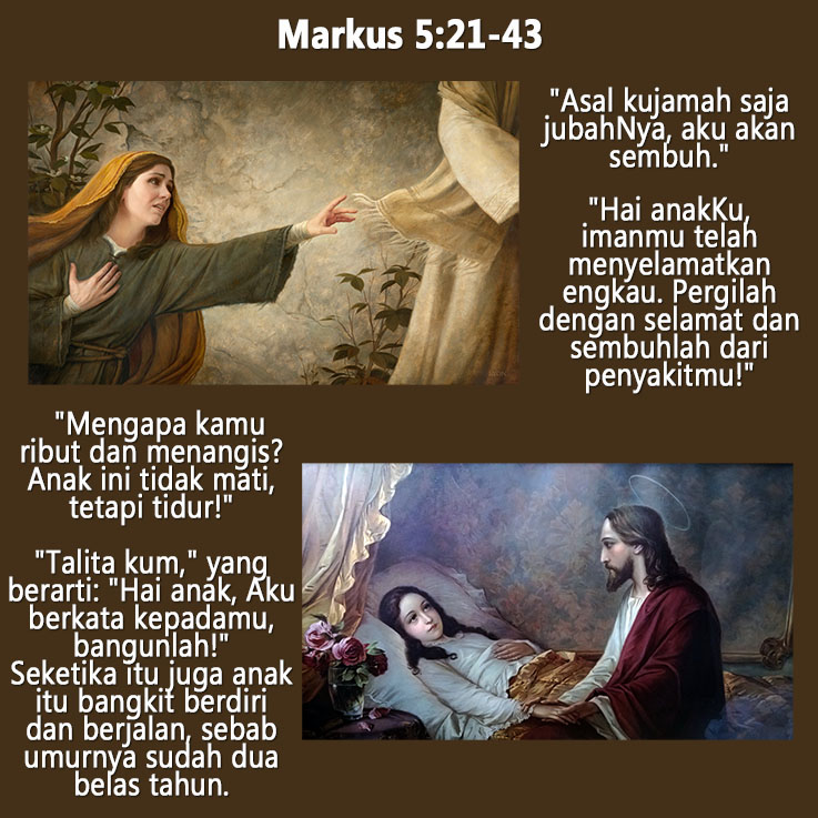 Injil Markus hari ini mengisahkan tentang Yesus menyembuhkan perempuan menderita pendarahan selama 12 tahun dan membangkitkan anak perempuan berusia 12 tahun, anak dari Yairus, kepala rumah ibadat.