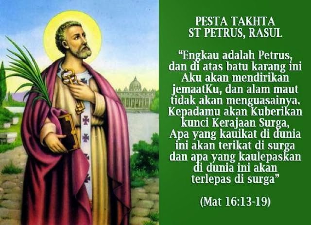Akupun berkata kepadamu: Engkau adalah Petrus dan di atas batu karang ini Aku akan mendirikan jemaatKu dan alam maut tidak akan menguasainya. Kepadamu akan Kuberikan kunci Kerajaan Sorga. Apa yang kauikat di dunia ini akan terikat di sorga dan apa yang kaulepaskan di dunia ini akan terlepas di sorga.”