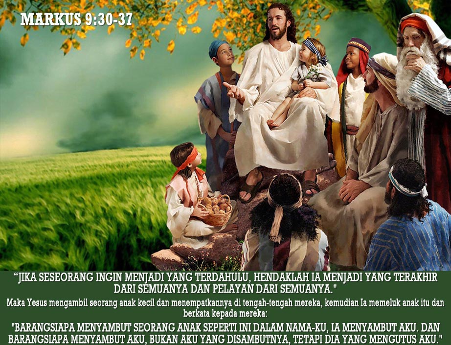 Maka Yesus mengambil seorang anak kecil dan menempatkannya di tengah-tengah mereka, kemudian Ia memeluk anak itu dan berkata kepada mereka: “Barangsiapa menyambut seorang anak seperti ini dalam namaKu, ia menyambut Aku. Dan barangsiapa menyambut Aku, bukan Aku yang disambutnya, tetapi Dia yang mengutus Aku.”