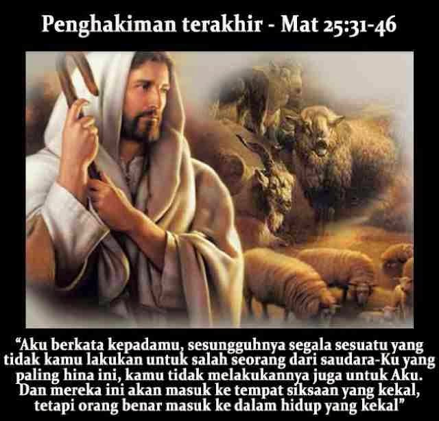Bacaan Injil hari ini dari perikop tentang penghakiman terakhir dimana pada hari itu setiap orang akan dipisahkan seperti gembala memisahkan domba di sebelah kanan dan kambing di sebelah kiri (baca ayat 31-33).