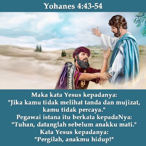 di Kapernaum ada seorang pegawai istana, anaknya sedang sakit ketika ia mendengar, bahwa Yesus telah datang dari Yudea ke Galilea, pergilah ia kepada-Nya lalu meminta, supaya Ia datang dan menyembuhkan anaknya, sebab anaknya itu hampir mati.