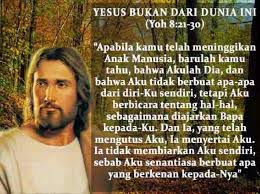 Yesus berkata kepada mereka: “Kamu berasal dari bawah, Aku dari atas; kamu dari dunia ini, Aku bukan dari dunia ini. Karena itu tadi Aku berkata kepadamu, bahwa kamu akan mati dalam dosamu; sebab jikalau kamu tidak percaya, bahwa Akulah Dia, kamu akan mati dalam dosamu.”