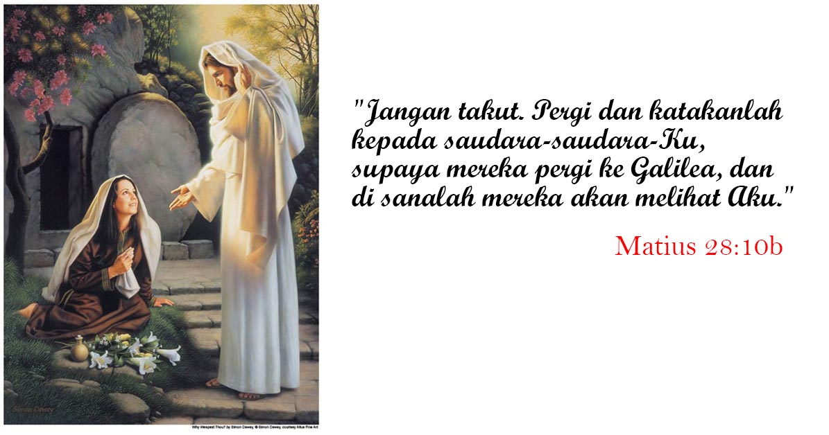 Malaikat itu berkata kepada perempuan-perempuan itu: “Janganlah kamu takut; sebab aku tahu kamu mencari Yesus yang disalibkan itu. Ia tidak ada di sini, sebab YESUS telah BANGKIT, sama seperti yang telah dikatakan-Nya. Mari, lihatlah tempat Ia berbaring”.