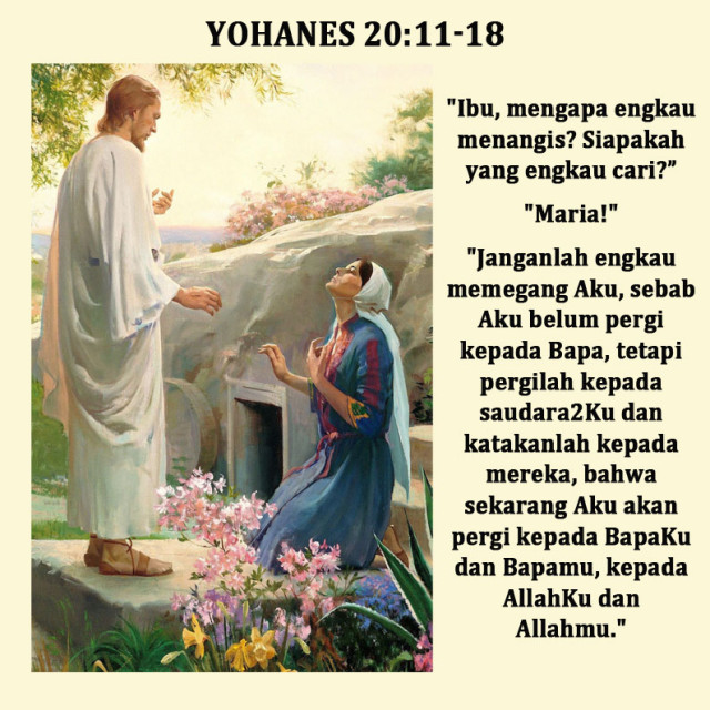 kata Yesus kepadanya: “Janganlah engkau memegang Aku, sebab Aku belum pergi kepada Bapa, tetapi pergilah kepada saudara-saudara-Ku dan katakanlah kepada mereka, bahwa sekarang Aku akan pergi kepada Bapa-Ku dan Bapamu, kepada Allah-Ku dan Allahmu.”