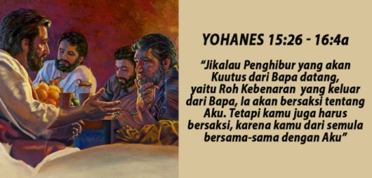 Injil Yohanes hari ini, Yesus mengatakan bahwa Roh Kebenaran yakni Roh Kudus diutus Bapa Surgawi setelah Yesus meninggalkan dunia ini, selain itu Yesus mengharuskan kita untuk bersaksi.