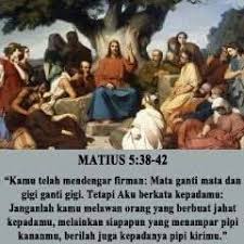 Aku berkata kepadamu: janganlah kamu melawan orang yang berbuat jahat kepadamu, melainkan siapapun yang menampar pipi kananmu, berilah juga kepadanya pipi kirimu.