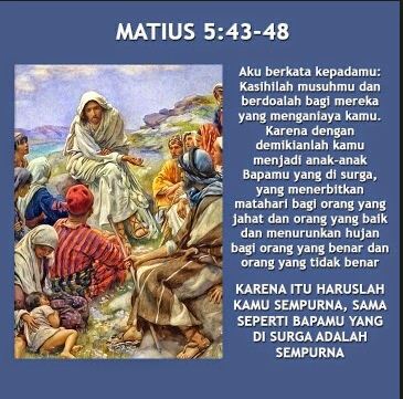 Tetapi Aku berkata kepadamu: kasihilah musuhmu dan berdoalah bagi mereka yang menganiaya kamu. karena dengan demikianlah kamu menjadi anak-anak Bapamu yang di sorga, yang menerbitkan matahari bagi orang yang jahat dan orang yang baik dan menurunkan hujan bagi
