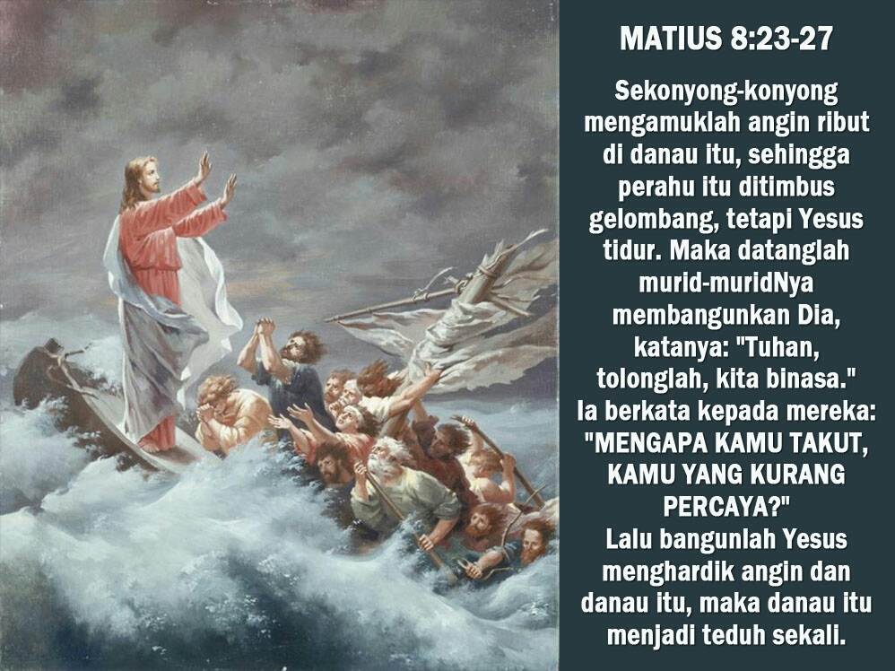 Yesus berkata kepada mereka: “mengapa kamu takut, kamu yang kurang percaya?” lalu bangunlah Yesus menghardik angin dan danau itu, maka danau itu menjadi teduh sekali.