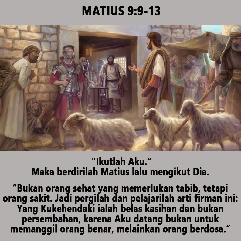 Setelah Yesus pergi dari situ, Ia melihat seorang yang bernama Matius duduk di rumah cukai, lalu Ia berkata kepadanya: “Ikutlah Aku.” Maka berdirilah Matius lalu mengikut Dia.