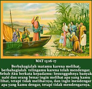 Berbahagialah matamu karena melihat dan telingamu karena mendengar. Sebab Aku berkata kepadamu: Sesungguhnya banyak nabi dan orang benar ingin melihat apa yang kamu lihat tetapi tidak melihatnya dan ingin mendengar apa yang kamu dengar, tetapi tidak mendengarnya.