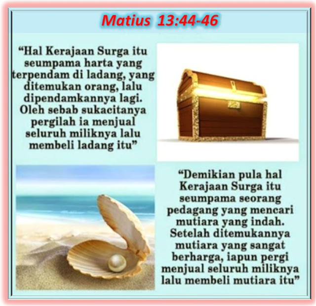 Yesus menasehati bahwa ada yang lebih berharga dari segala sesuatu berharga dari dunia ini dengan menggunakan perumpamaan tentang harta terpendam dan mutiara berharga.