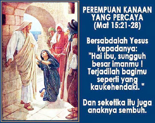 Kita perlu belajar dari iman perempuan Kanaan yang tetap tegar meski ditekan oleh murid Yesus dan penolakan Yesus sebab ia tahu ini adalah ujian imannya.