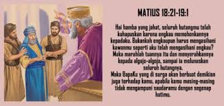 Kemudian datanglah Petrus dan berkata kepada Yesus: “Tuhan, sampai berapa kali aku harus mengampuni saudaraku jika ia berbuat dosa terhadap aku? Sampai tujuh kali?” Yesus berkata kepadanya: “Bukan! Aku berkata kepadamu: Bukan sampai tujuh kali, melainkan sampai tujuh puluh kali tujuh kali.