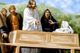 Kemudian Yesus menyentuh usungan dan berkata: “Hai anak muda, Aku berkata kepadamu, bangkitlah!”, anak itu bangkit dan hidup kembali.