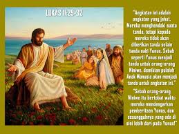 Ketika orang banyak mengerumuniNya, berkatalah Yesus: “Angkatan ini adalah angkatan yang jahat. Mereka menghendaki suatu tanda, tetapi kepada mereka tidak akan diberikan tanda selain tanda nabi Yunus.