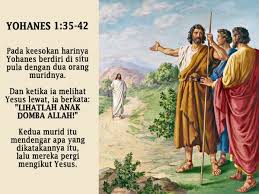 Yohanes Pembaptis berkata: “Lihatlah Anak Doma Allah” kepada Yesus dan kedua murid Yohanes mendengarnya, lalu mengikuti Yesus diantaranya adalah Andreas, kemudian mengajak Simon, saudaranya agar mengikut Yesus juga.