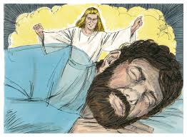 Ketika Yusuf mempetimbangkan akan menceraikan tunangannya dengan diam2 maka malaikat Tuhan nampak kepadanya dalam mimpi dan berkata agar Yusuf tidak takut mengambil Maria sebagai isterinya sebab anak yang dikandungnya dari Roh Kudus yang menyelamatkan umatNya dari dosa mereka.